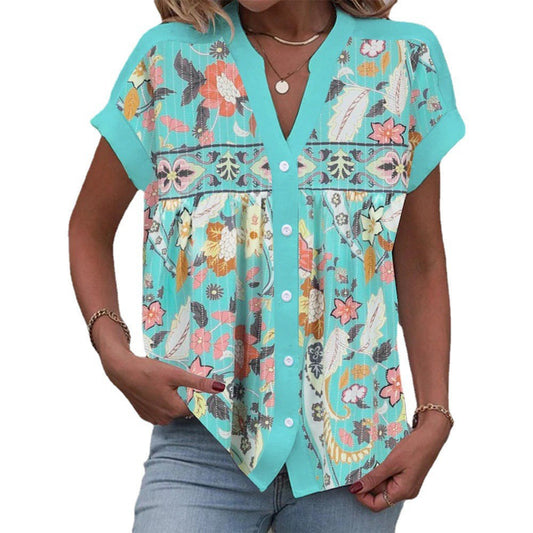 Casual Stand Collar Short Sleeve Regular Cardigan Digital Printing Top Shirt
