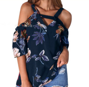 T-shirt printed with short sleeves and shoulder exposed v-neck sling for women