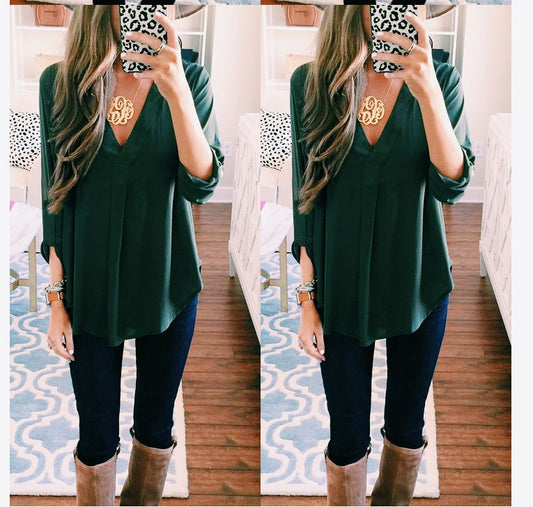 V-neck Long-sleeved Shirt Plus Size Loose T-shirt For Women