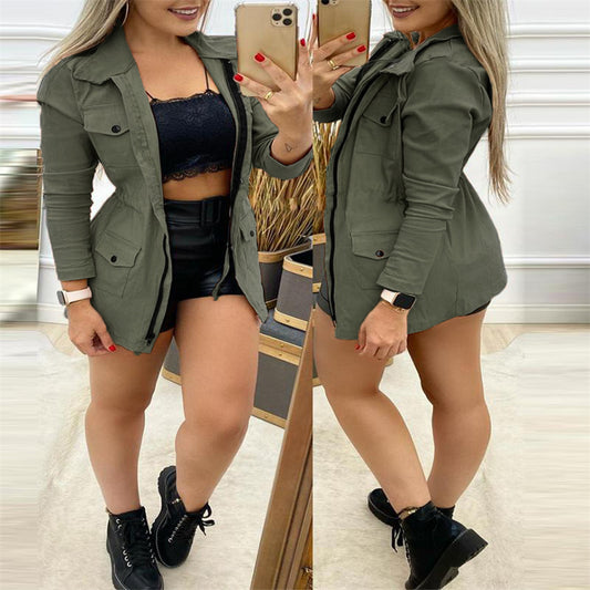 European And American Fashion Women's Wear Pink Leisure Cargo Waist Drawstring Coat