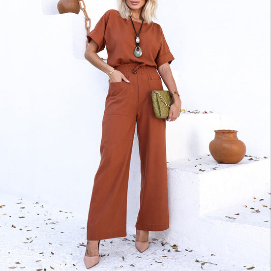 Women's Fashion Temperament Crew Neck Short-sleeved T-shirt Wide-leg Pants Suit
