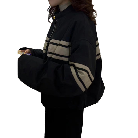 立領毛絨外套冬季長袖寬鬆拉鍊開襟衫時尚純色棋盤格設計外套女外套